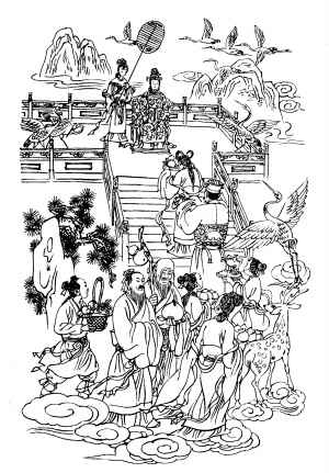 かつては疫病や刑罰をつかさどる神様だったようですが、周から漢の時代にかけて不老不死の薬(霊丹妙薬(れいたんみょうやく))や桃(蟠桃(はんとう))を有する、長寿の神様と変化しました。