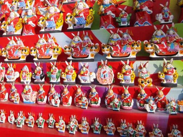 それから人々はこの月兔を表す泥人形を作るようになりました。鹿に乗ったり、鳳凰に乗ったりしているもの、甲冑を身に着けているもの、いろいろな職人さんの姿をしたもの。さまざまな姿があり、とてもかわいらしいです。