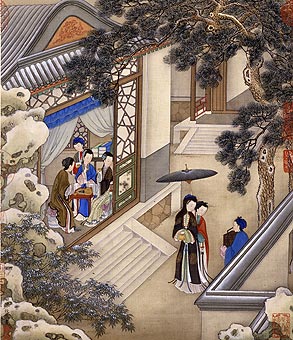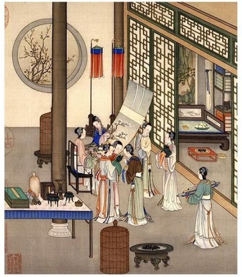 宮中の后妃の桐の木陰で、針占いをしている様子です。