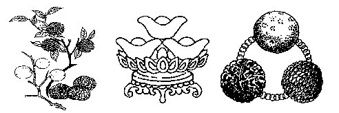 元をいろいろなものであらわしていますが、上は「元宝」、お金、三つの穴あき銭の真ん中を一本の矢が射抜いています。下の真ん中も「元宝」が三つです。中国の金や銀は昔このような形に鋳造されていました。そして下の左右は、丸い茘枝(ライチ)、桂円(龍眼)、胡桃で「円(yuan)」=「元yuan」で三元をあらわしています。一番下のデザインは丸い実が三つなっている木にカカサギが止まっていますが、「喜報三元」という三元合格の喜ばしい報告を意味しています。カカサギは中国語で「喜鵲」といい、名前からおめでたいデザインの中にはよく登場します。