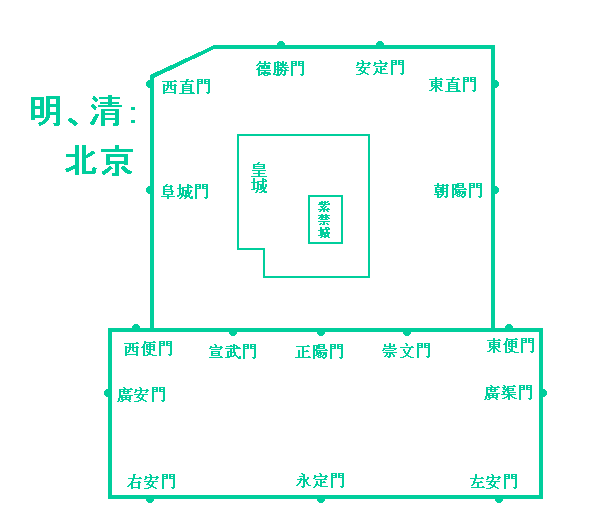 そんななかから、いわゆる国都であった時代の北京の都の形を大雑把な地図で紹介します。