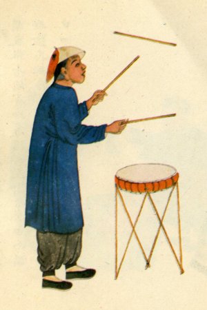 普通太鼓は日本の撥で鳴らしますが、三本の撥を使うので「三棒鼓」です。