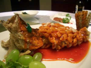 リスを使った料理ではなく、「桂魚の松の実入り甘酢あんかけ」なのですが、必ず付け合せには葡萄がついています。魚を揚げた形が、リス(松鼠)に見えるからとこの名が付いたといいますが、これに葡萄を付け合せにして、「松鼠葡萄」を表しているわけです。なかなか凝ったことをしますよね。もちろん他のお店でもこの料理は出るのですが葡萄はあまり付いていません。オリジナルならではのこだわりでしょうか。蛇足ですが、蘇州大好き?だった清の乾隆帝はこの料理がお気に入りだったようです。