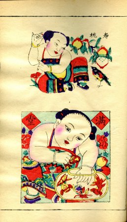 楊家埠年画選:蘭房生貴子、桂閣産麒麟月の宮に麒麟が生まれ、我が家には大切な子供が生まれる.... といった対句が添えられています。(ちなみに蘭房は、美しい人の部屋。桂閣は、月の宮殿のこと)
